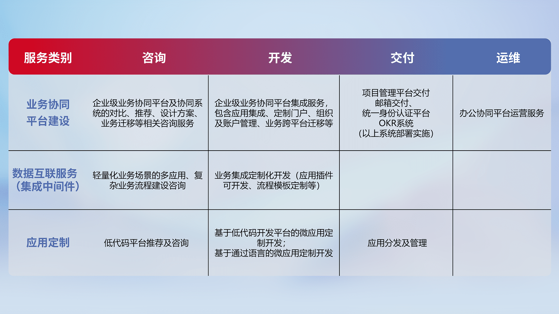 针对钉钉、、、、企微、、、、IDaas等平台级产品提供产品的规划、、方案、、、交付、、、定制化开发等服务,,,,实现如统一协同办公、、智能客户服务、、、、混合会议管理、、、智能数据查询、、、、等业务场景,,实现数字化转型。。